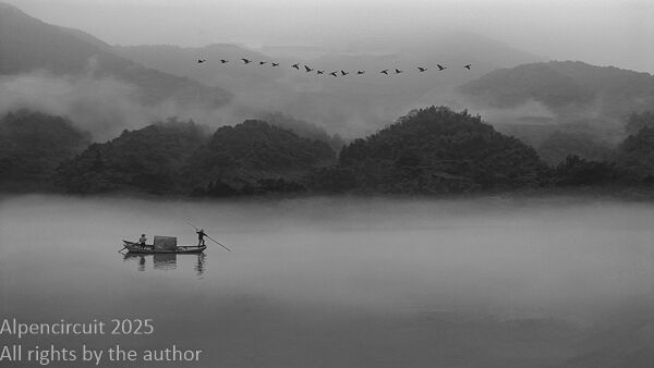 Zhong, Zhitang, China, Skiff passes myriad mountains -